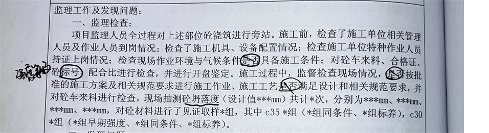 2、近期在对项目检查过程中发现:混凝土施工旁站记录中的‘监理工作及发现问题’完全照搬照抄,比如: